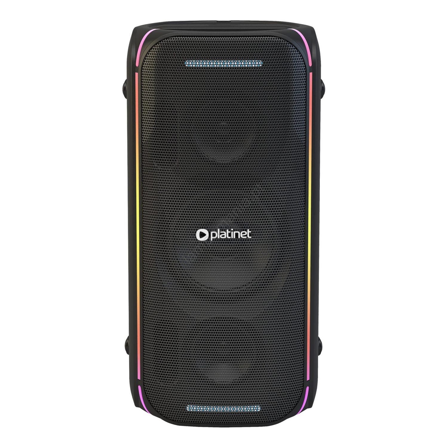 • O painel frontal apresenta iluminação LED que reage à música e cria uma atmosfera visual envolvente.
