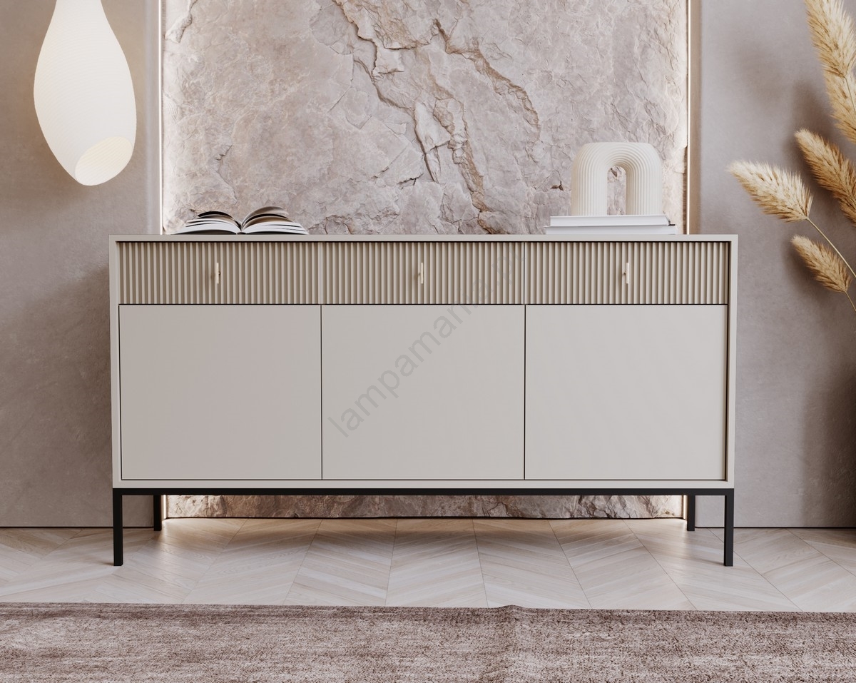 • Possui três portas inferiores com amplo espaço de armazenamento e três gavetas com puxadores e frisos verticais.