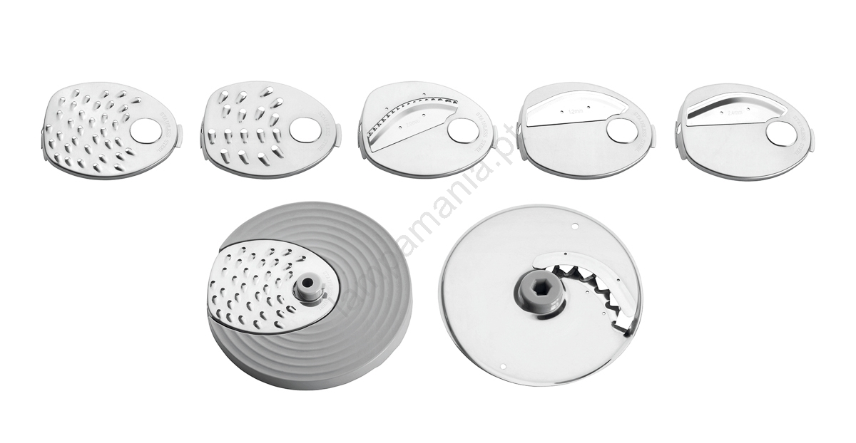 • 5 lâminas intercambiáveis e 1 disco para cortar batatas fritas (compatível com lavagem na máquina de lavar louça).