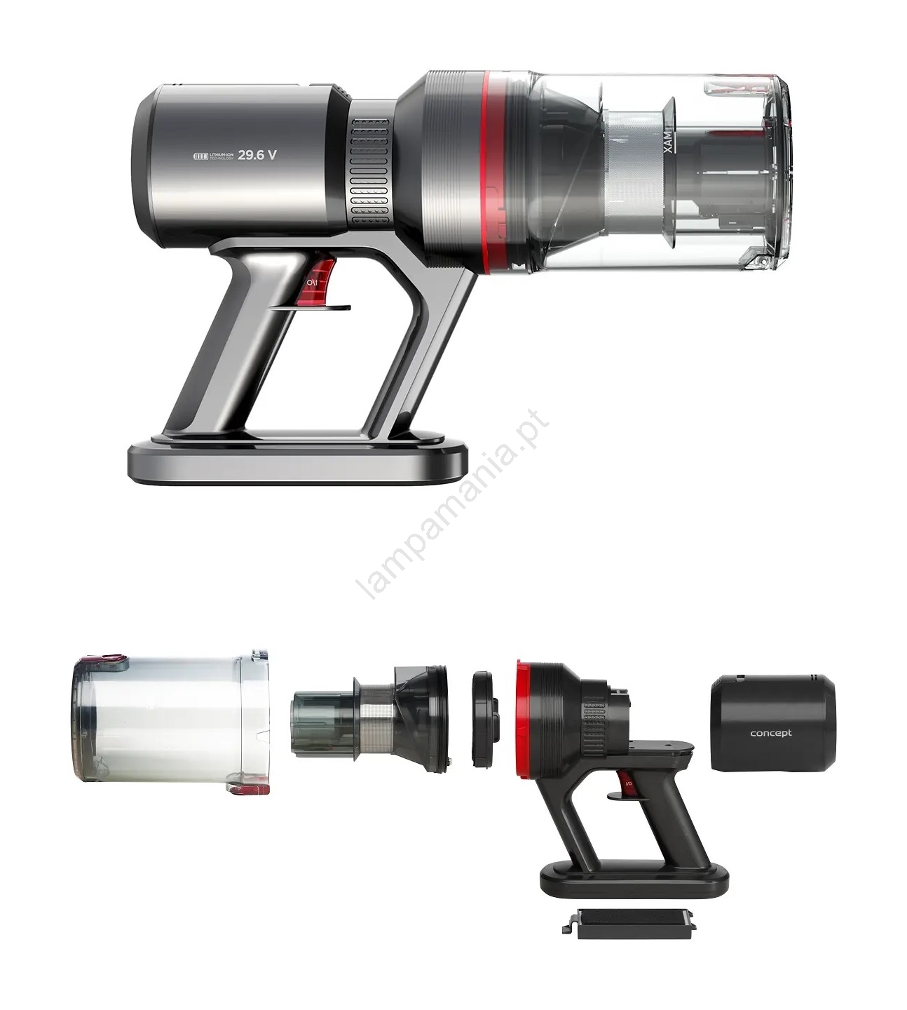 • No corpo do aspirador encontra-se uma bateria Li‑Ion destacável de 2200 mAh, que se destaca pela elevada autonomia e longa vida útil.