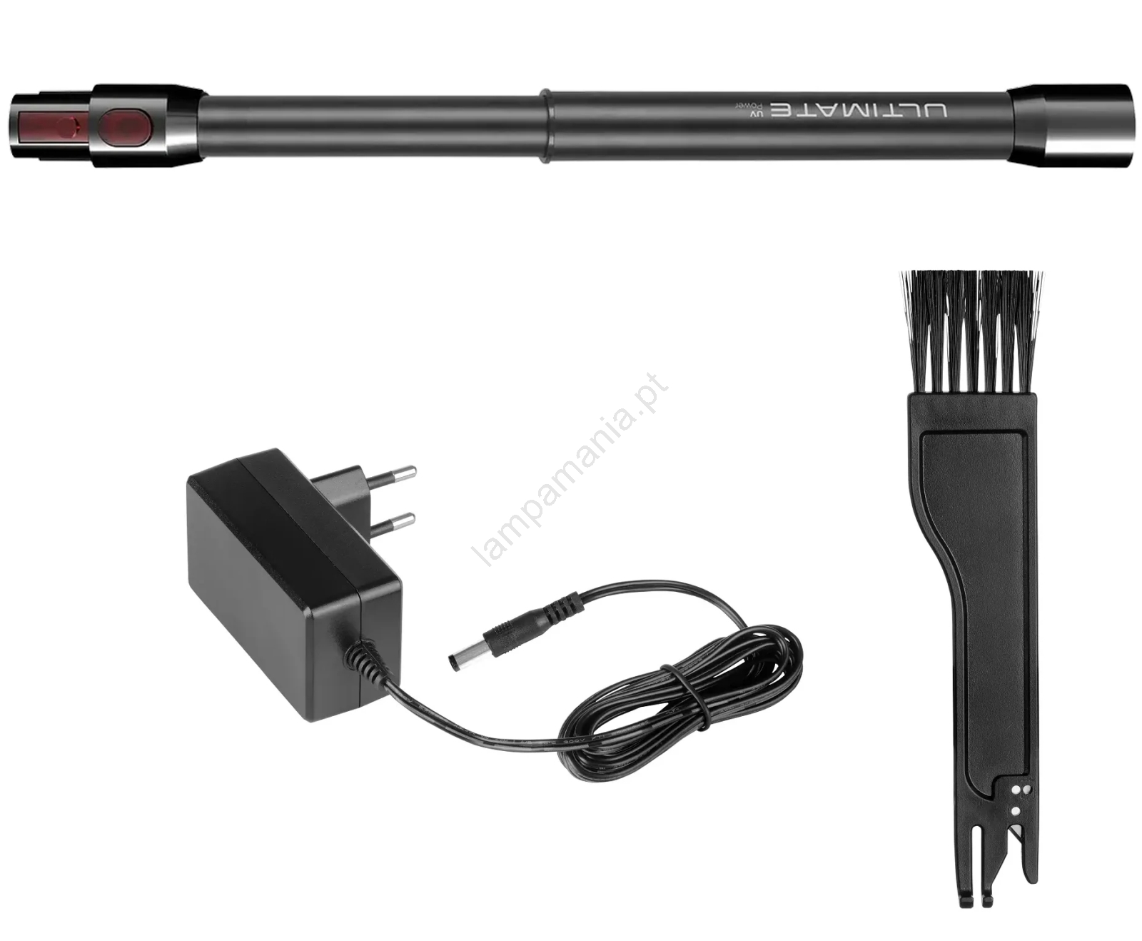 • Acessórios incluídos na embalagem: Extensão flexível na parte superior do aspirador, pequena escova turbo UVC, escova HardFloor, escova Carpet, mangueira flexível, bocal para fendas, bocal para fendas com escova, bocal para estofos, adaptador de alimentação.