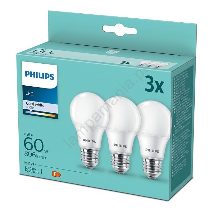 CONJUNTO 3xLâmpada LED Philips A60 E27/8W/230V 4000K O design de alta qualidade garante uma iluminação perfeita do seu interior. A categoria E27 é dedicada às lâmpadas com o mesmo casquilho. Na nossa loja virtual, pode escolher entre lâmpadas com filamento tradicional ou lâmpadas LED modernas, que são mais eficientes em termos energéticos e têm uma vida útil mais longa.
