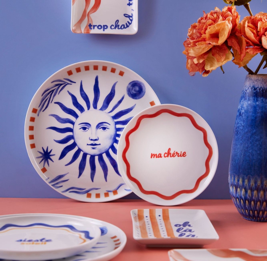 Conjunto de jantar 12 peças em porcelana — vermelho/azul/branco