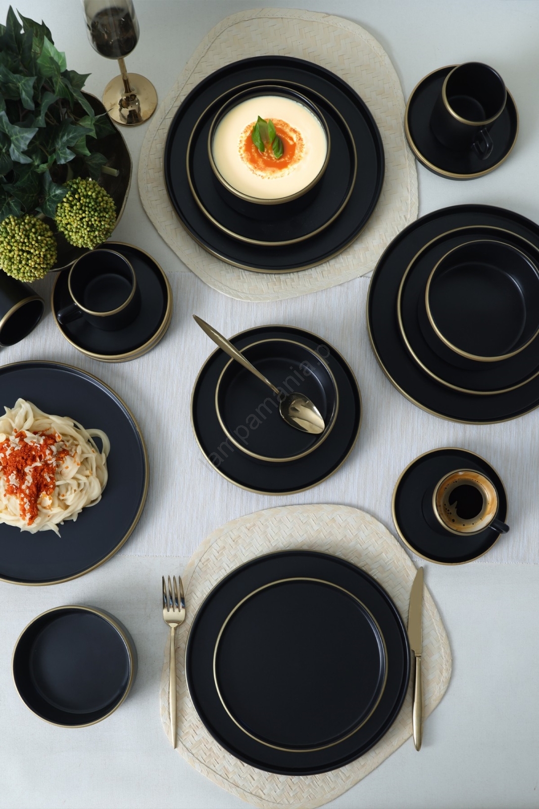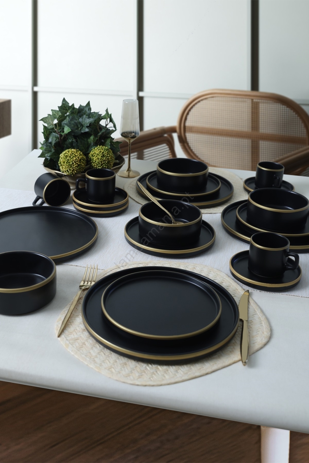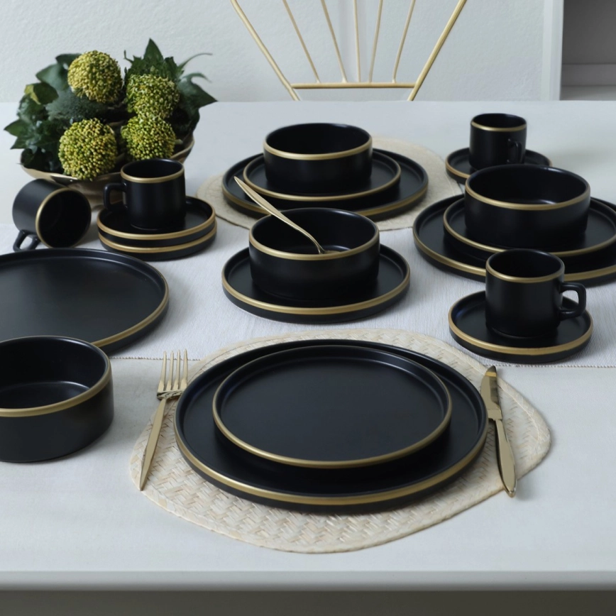 Conjunto de loiça de jantar 20 peças, preto/dourado, em grés