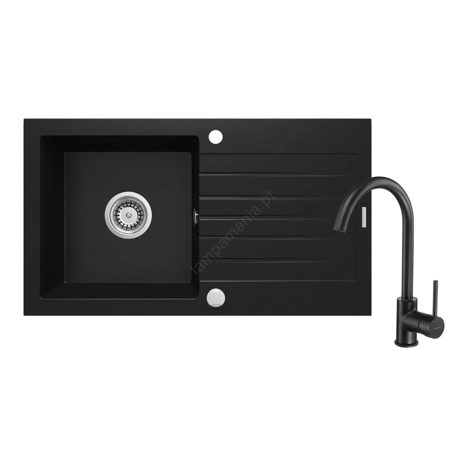 • Conjunto de pia de granito com torneira na cor preta.