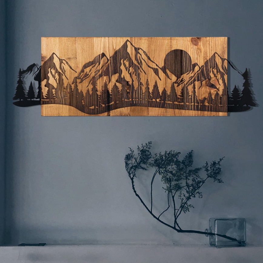 • O motivo na madeira é gravado a laser e as partes metálicas estão fixadas à madeira.