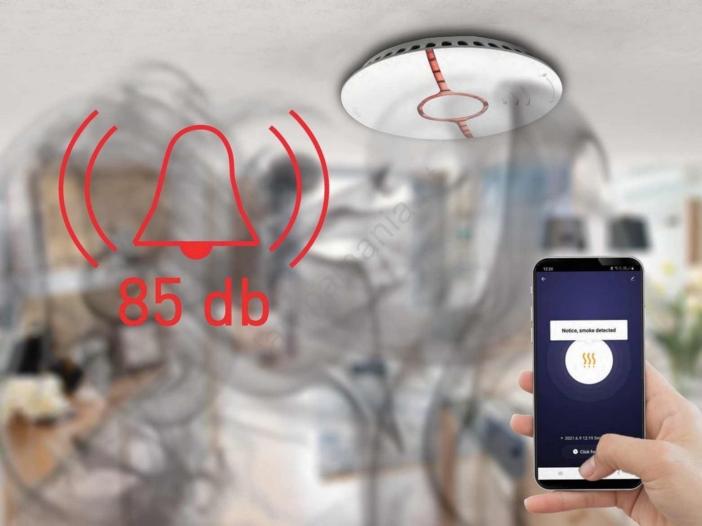 • Alerta de presença de fumaça através de um alarme acústico (85 db) e notificações para o seu smartphone.