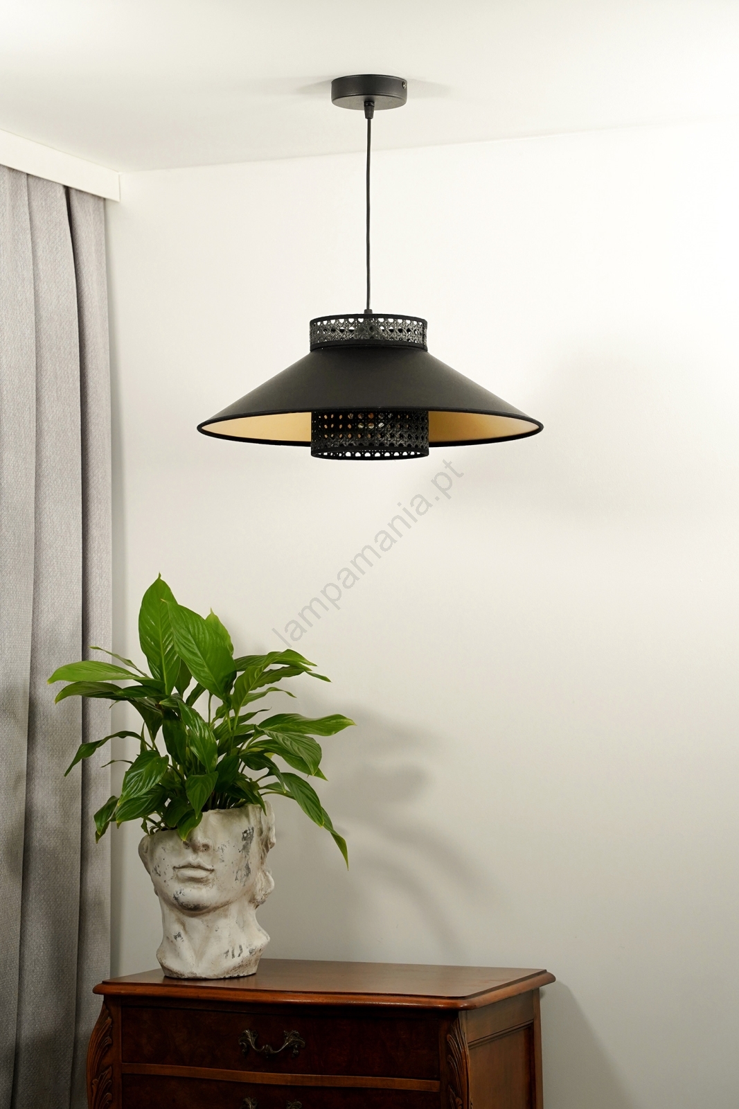 Duolla - Candeeiro suspenso RIO RATTAN 1xE27/15W/230V diâmetro 45 cm preto/dourado caracteriza-se por um design agradável e funcional.  Uma lâmpada com casquilho E27 é adequada para a iluminação Aqui, pode comprar outras lâmpadas a preços vantajosos. Terá um complemento interessante para a sua casa.