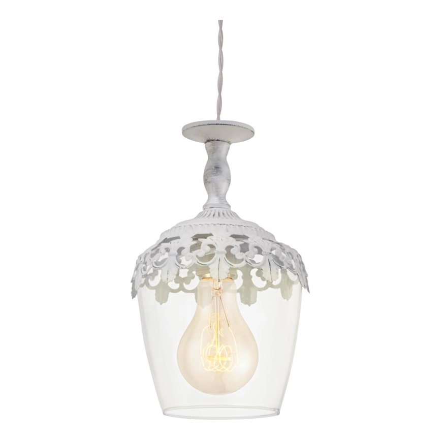 • O abajur de vidro transparente está fixado em uma estrutura de metal branco com acabamento patinado.