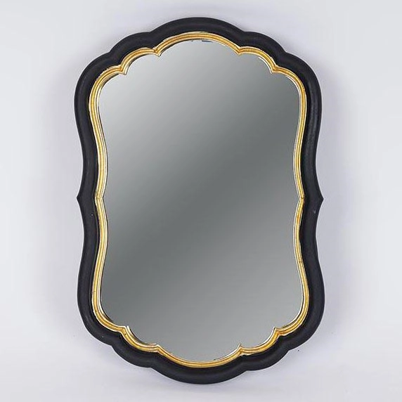 • O espelho possui um contorno irregular, suavemente curvado, com delicados relevos decorativos.