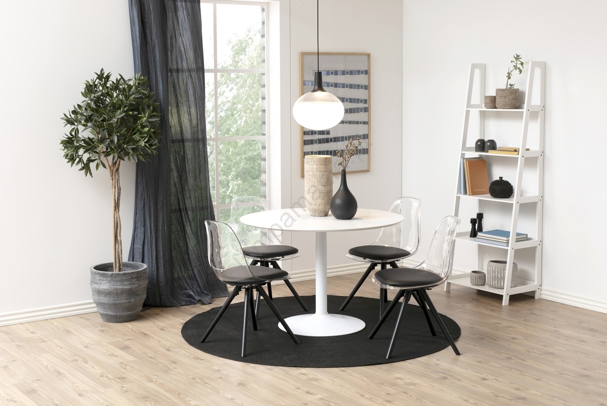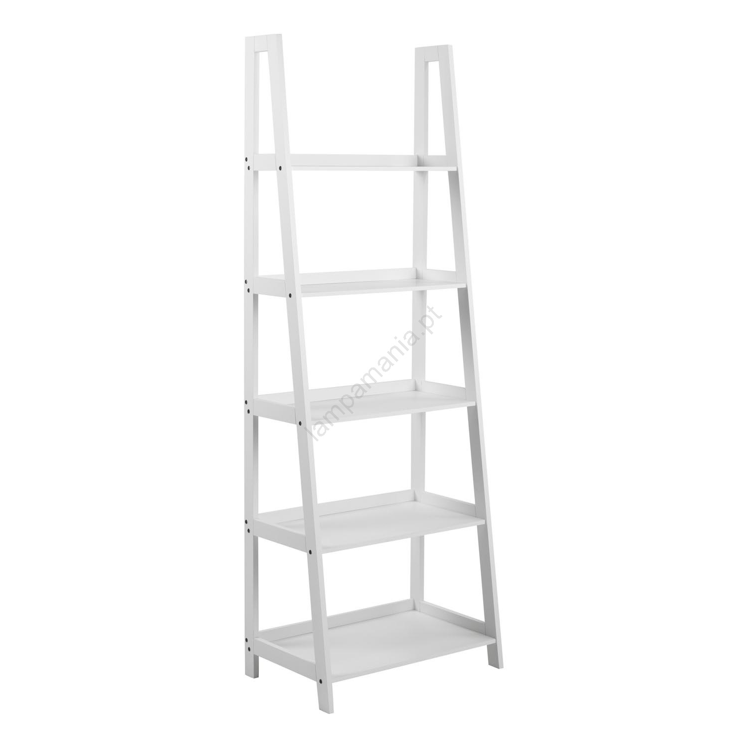 • Estrutura e base em MDF lacado branco NC, 5 prateleiras em MDF lacado UV branco.