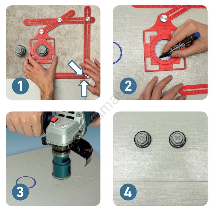 • O localizador plástico de várias partes é útil para determinar com precisão a posição do furo perfurado, por exemplo, ao revestir banheiros.