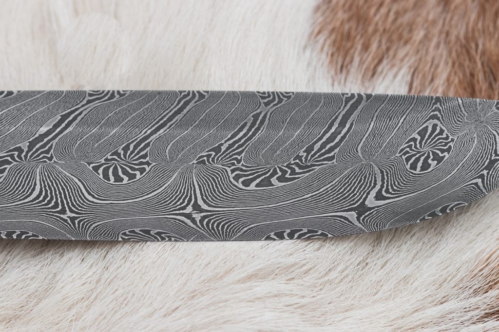 Facas damasquinadas, frequentemente chamadas de damasco, representam uma obra-prima da arte da ferreiro e da cutelaria. A característica distintiva dessas facas é o padrão decorativo único na lâmina, alcançado pela combinação de dois ou mais tipos de aço com diferentes propriedades. Este processo é realizado por forjamento a altas temperaturas, resultando no que é conhecido como damasco soldado. Facas forjadas dessa maneira são excepcionalmente de alta qualidade. Graças a este processo de fabricação, as facas obtêm o melhor dos aços utilizados. Comumente, combina-se aço duro com alto teor de carbono com aço tenaz, o que confere à faca uma excelente dureza, resistência ao desgaste e à quebra.