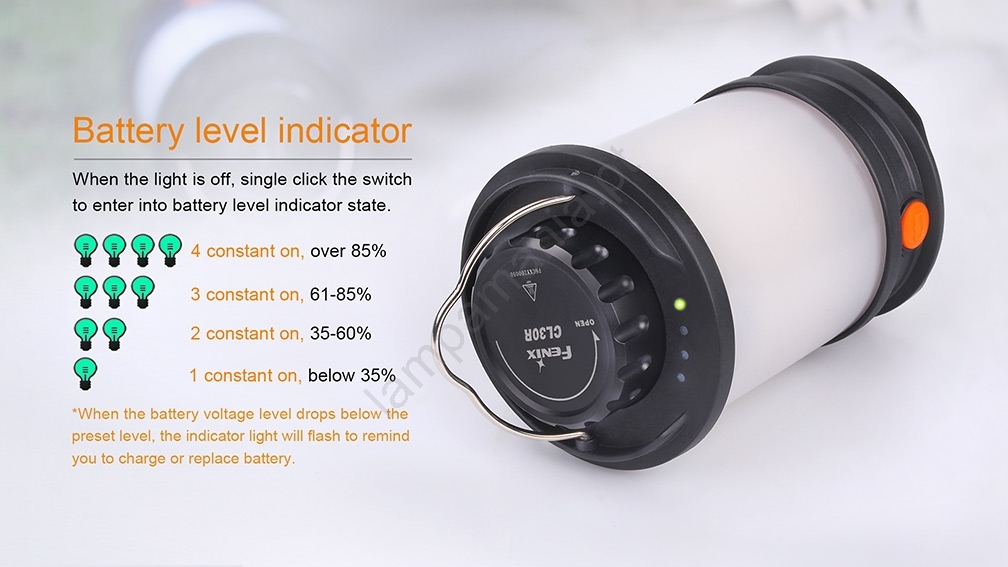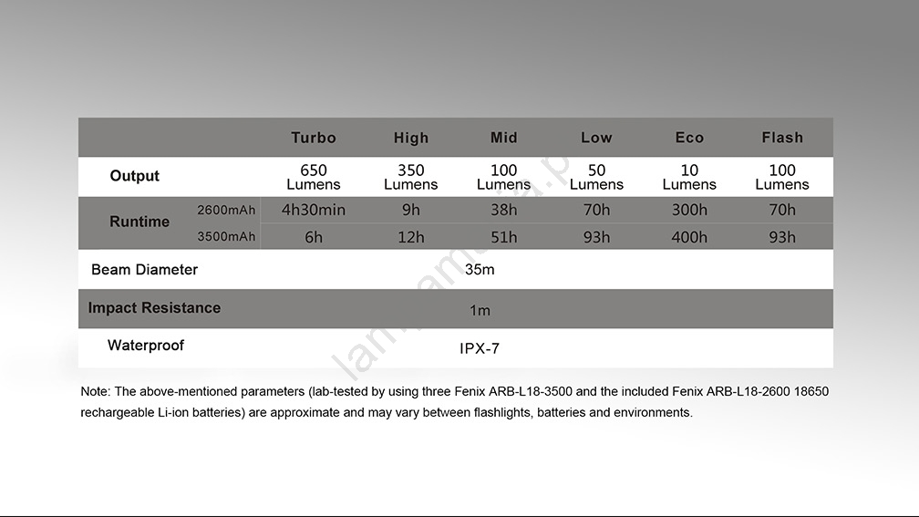 • Medido com a bateria Li-ion 18650 de 3500 mAh: 650 lúmens: (6 horas) -> 350 lúmens (12 horas) -> 100 lúmens (51 horas) -> 50 lúmens (93 horas) -> 10 lúmens (400 horas) -> piscar 100 lúmens (93 horas).