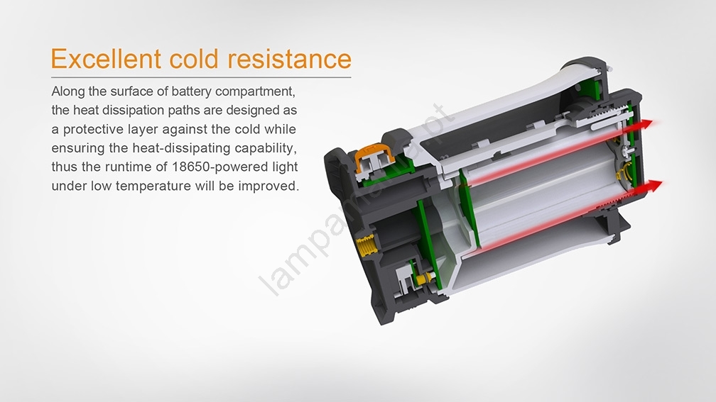 • Construção resistente ao frio, as baterias estão bem isoladas contra baixas temperaturas, permitindo o uso da lanterna mesmo em temperaturas muito abaixo de zero.