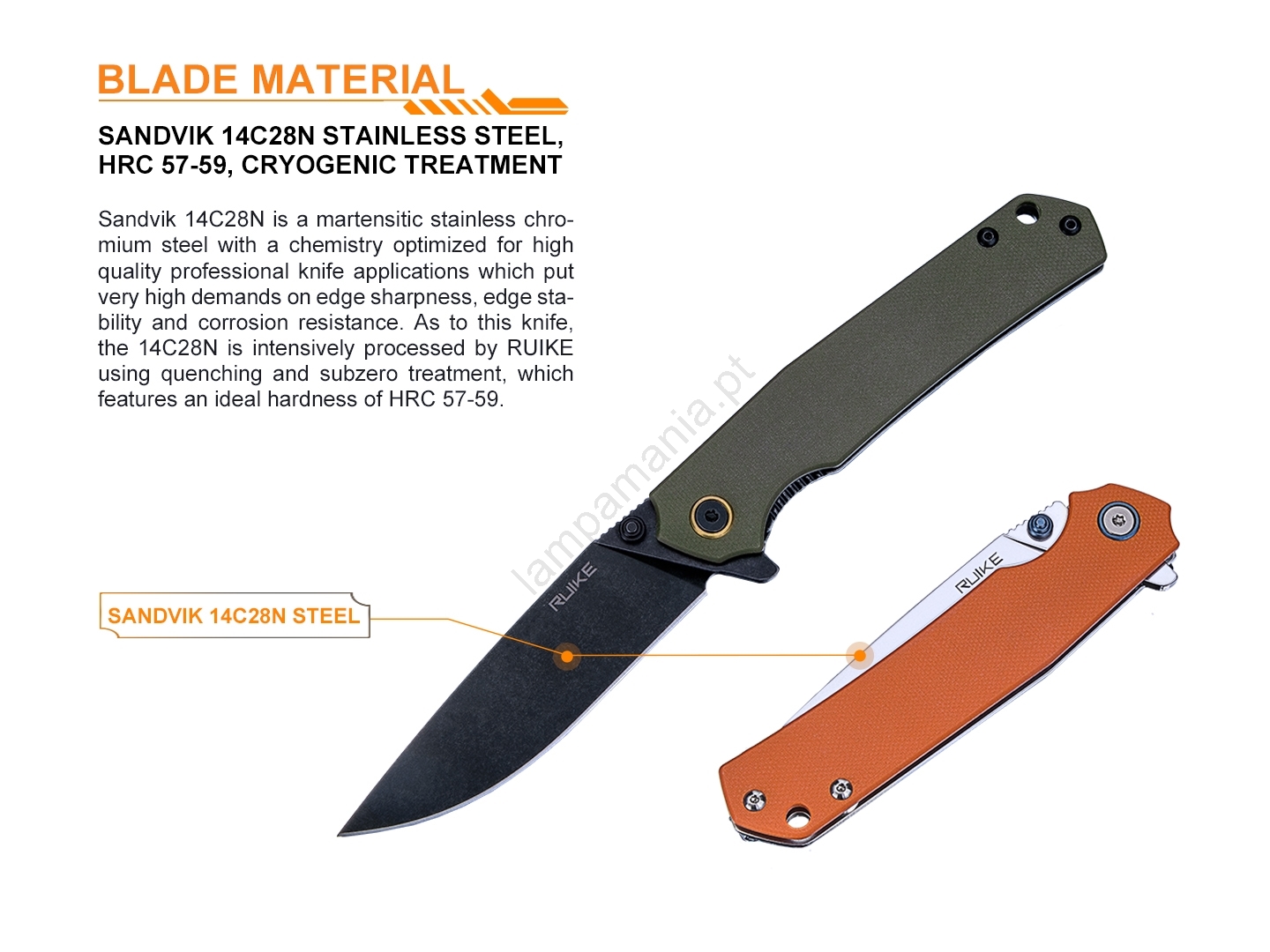 • As lâminas das facas Ruike são fabricadas em aço martensítico cromado Sandvik 14C28N, com composição química e estrutura cristalina otimizadas.