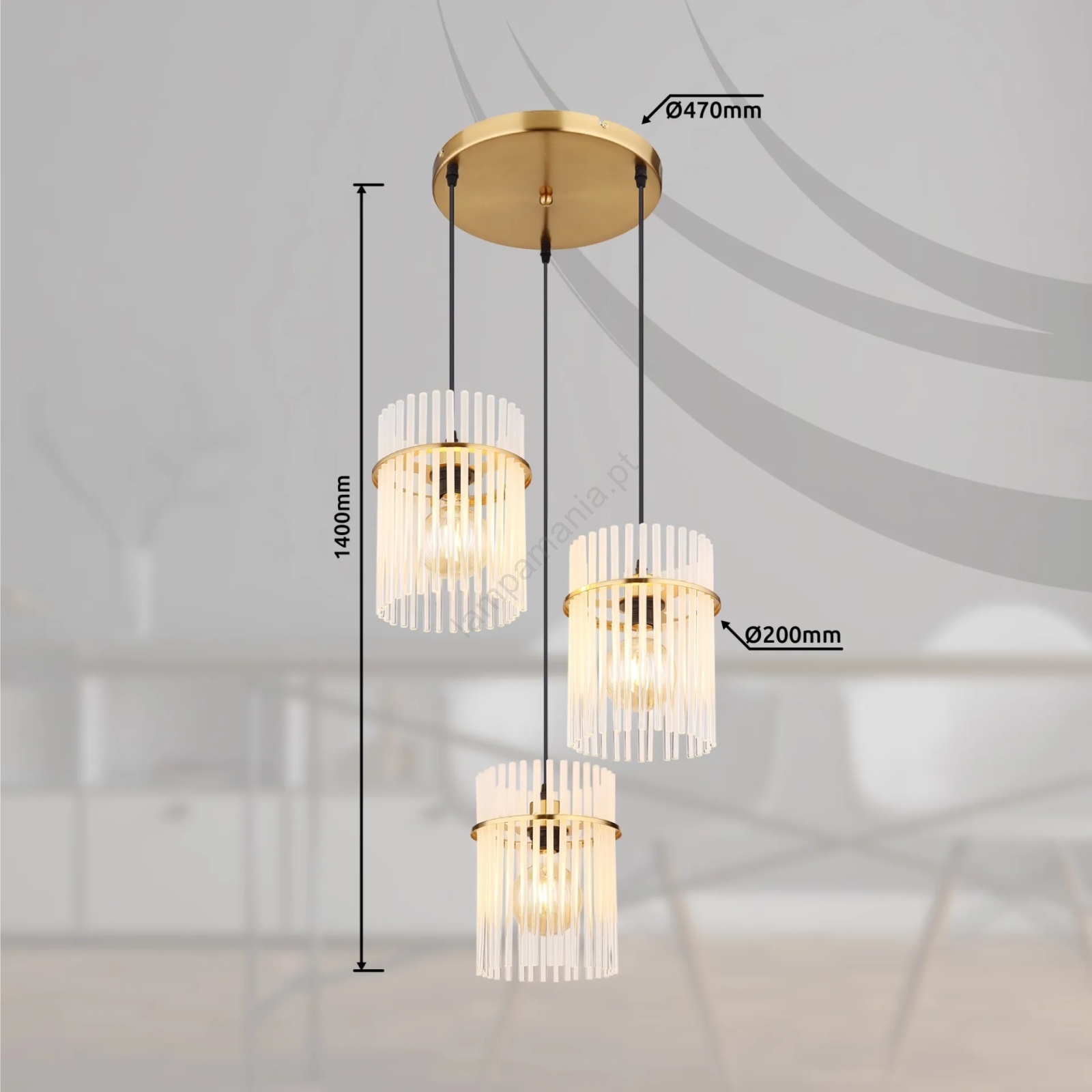 Globo - Candeeiro suspenso 3xE27/60W/230V diâmetro 47 cm dourado caracteriza-se por um design agradável e funcional.  Uma lâmpada com casquilho E27 é adequada para a iluminação Aqui, pode comprar outras lâmpadas a preços vantajosos. Terá um complemento interessante para a sua casa.