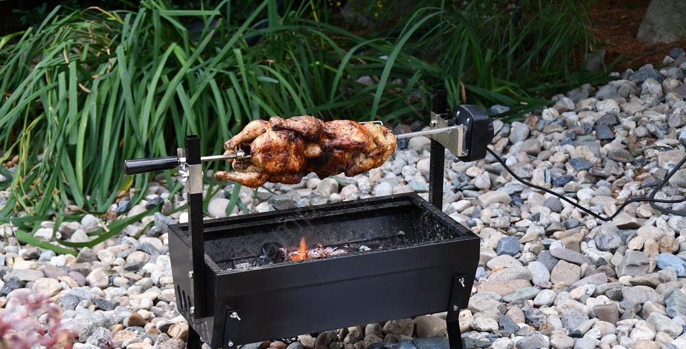 • Grelhador a carvão com construção robusta BARBECUE com motor para virar alimentos.