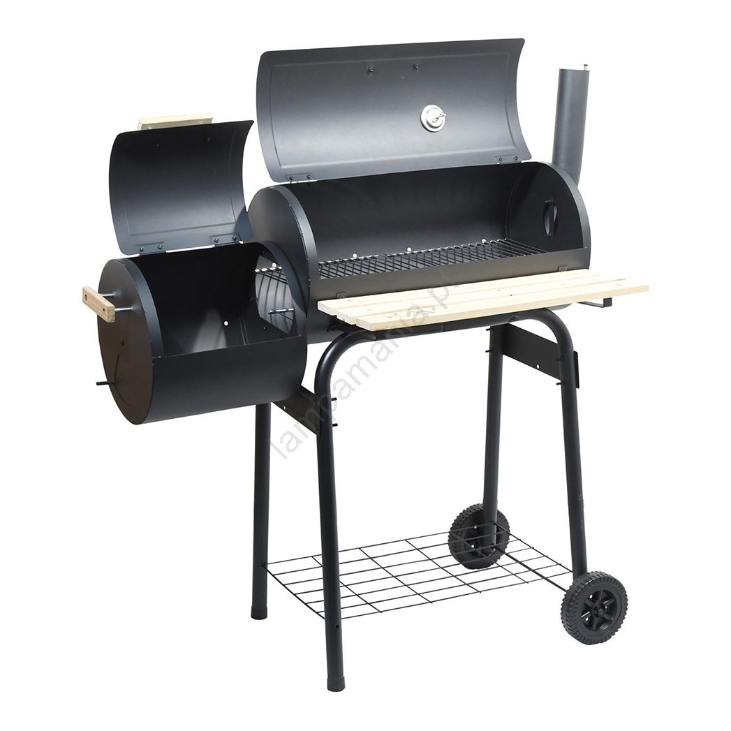 • O grelhador apresenta uma chaminé com uma tampa com fecho, uma área de grelhagem espaçosa com uma grelha de aço cromado, uma tampa, e uma área de grelhagem secundária para grelhar de forma indirecta ou para grelhar.