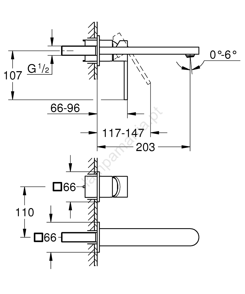 • A distância entre o centro da alavanca e a bica é de 110 mm, comprimento da bica 203 mm.