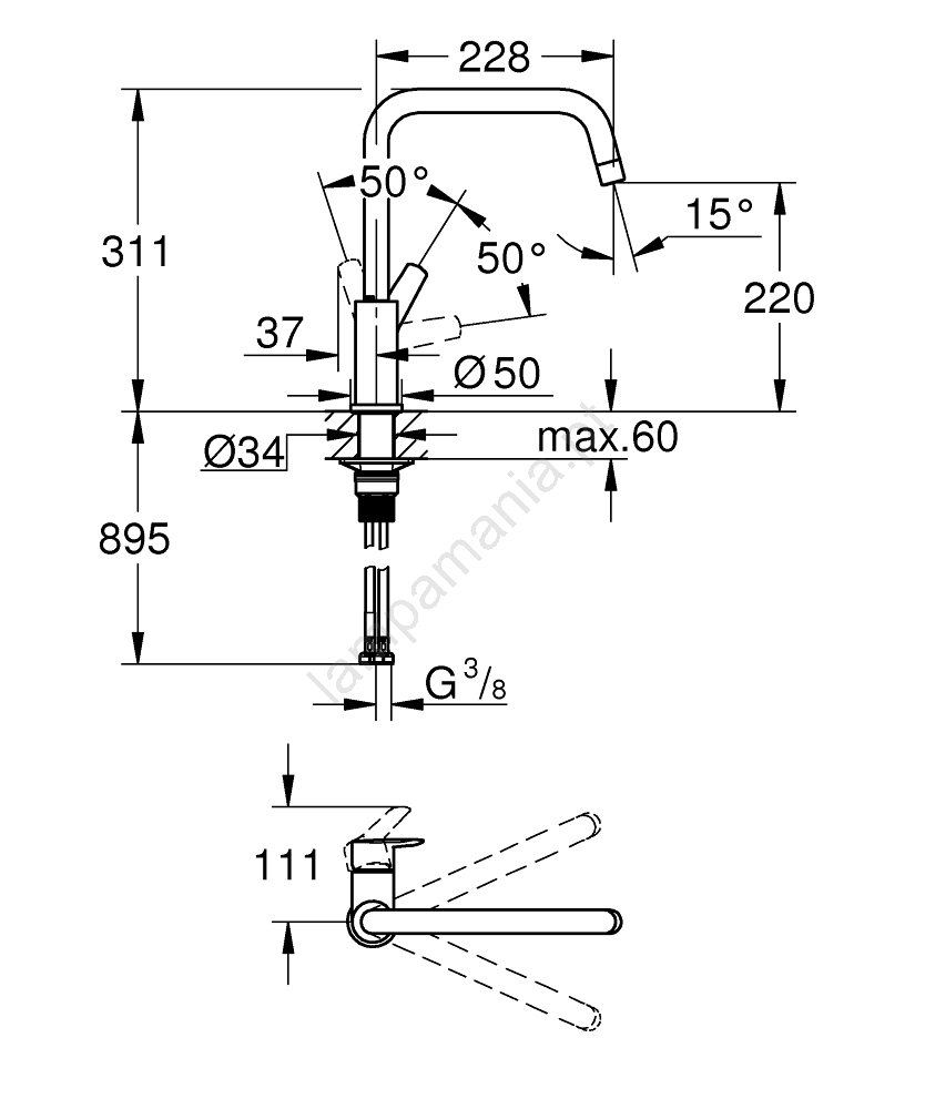 • Altura da torneira 311 mm e comprimento da bica 228 mm para utilização confortável.
