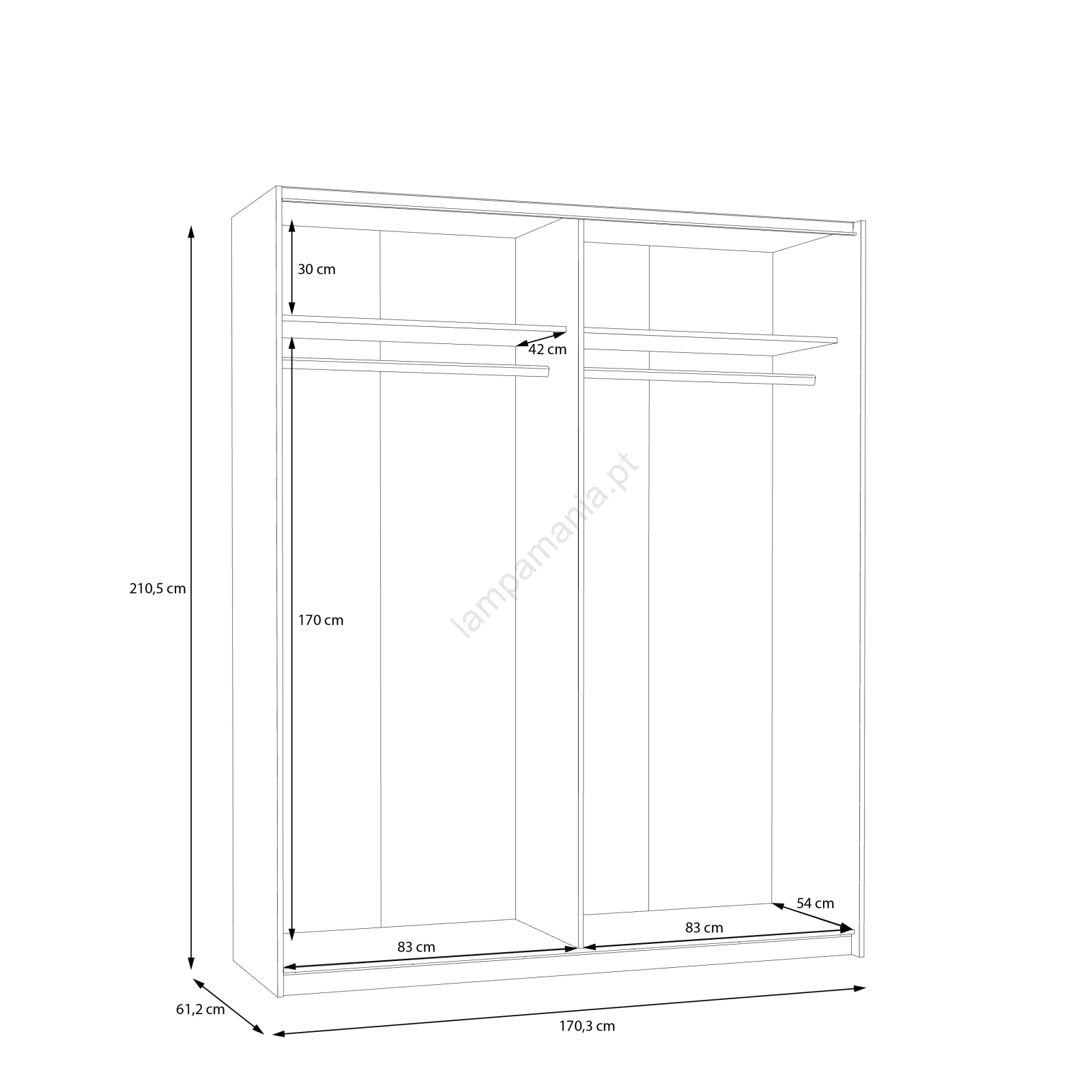 • O roupeiro inclui varões para cabides, prateleiras e um amplo espaço de arrumação para a sua roupa, malas e artigos sazonais.