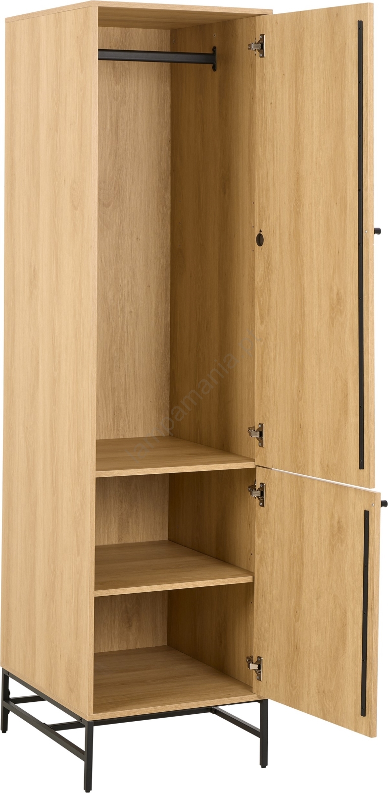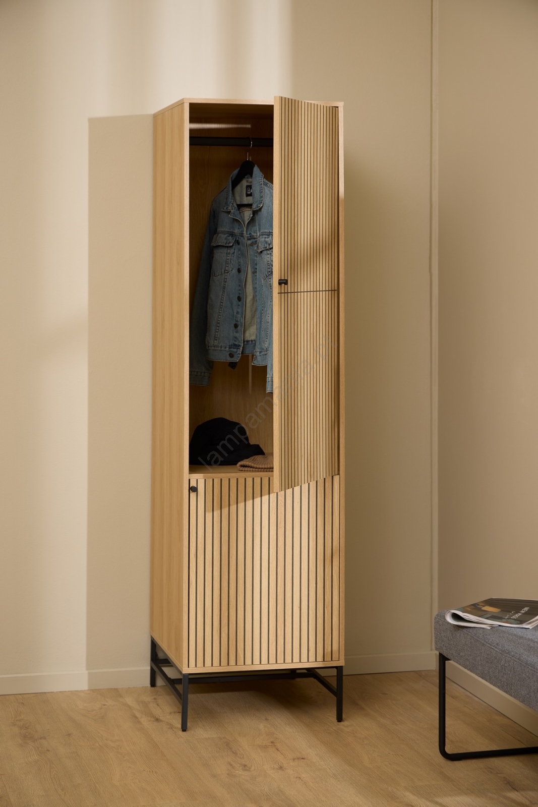 • Estrutura, 2 portas e 2 prateleiras em melamina craft de textura robusta, base em aço pintado a pó preto mate de acabamento resistente.