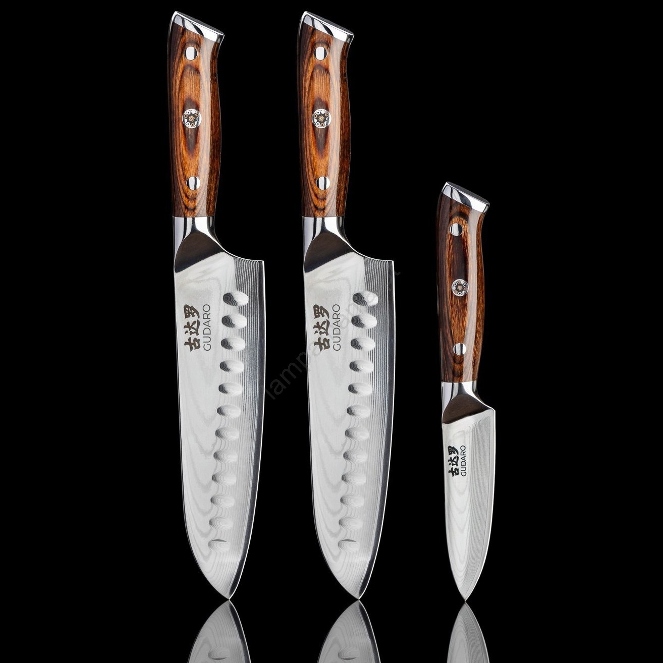 • Todas as lâminas do conjunto são fabricadas a partir de 67 camadas de aço damasco com um núcleo extremamente duro em aço japonês VG10, garantindo afiação superior, elevada resistência e longa estabilidade do fio.