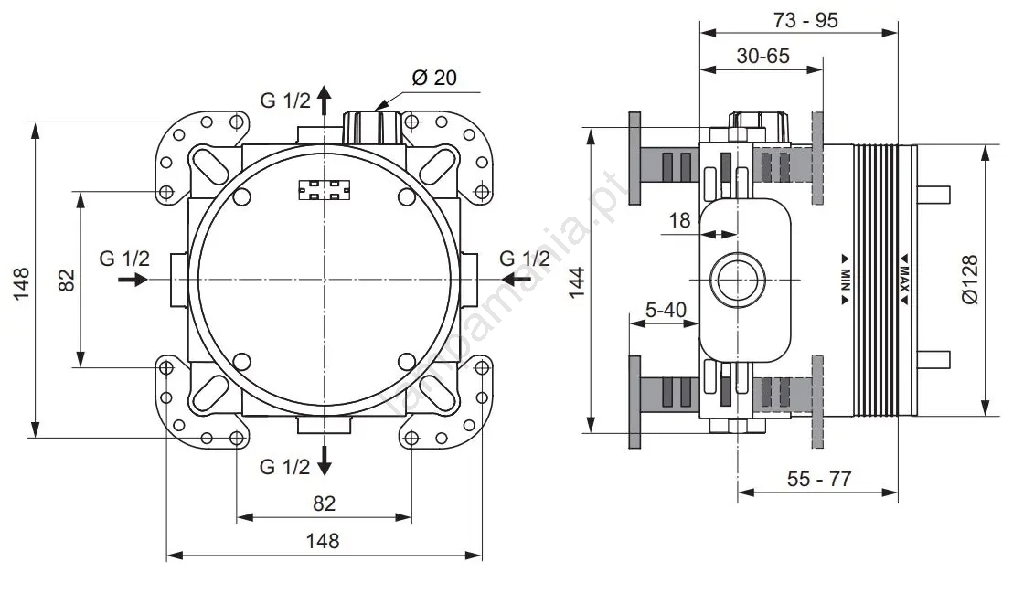 • A profundidade total de instalação varia entre 73 e 95 mm, sendo a profundidade ajustável de 5 a 40 mm.