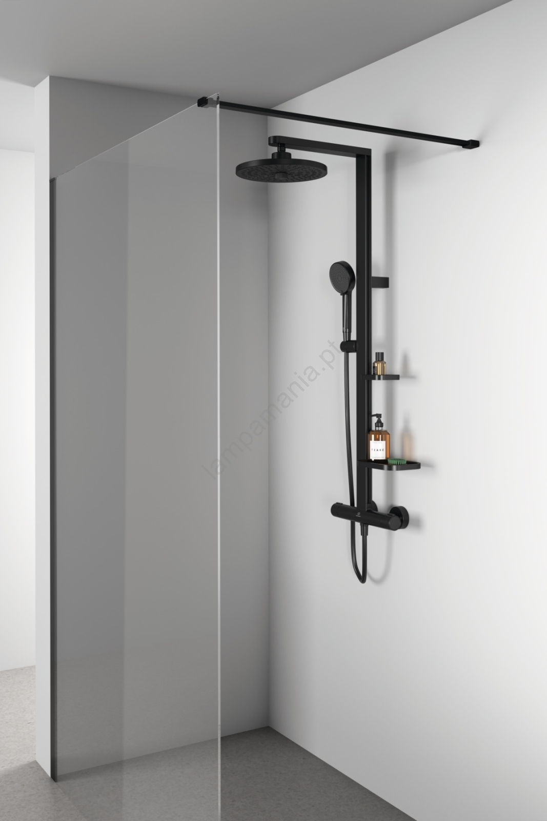 • A barra inclui um suporte deslizante para a duche de mão e duas prateleiras reguláveis em altura (prateleira e saboneteira).