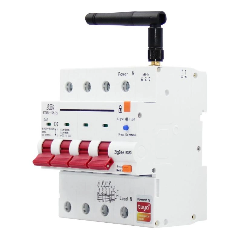 • Disjuntor trifásico 10-63A com interruptor diferencial, medição de consumo, 3P+N, Zigbee 3.0, destinado a circuitos de corrente alternada 50/60 Hz com tensão nominal de 230/400 V e corrente de comutação de 10A, 32A, 40A, 50A, 63A.