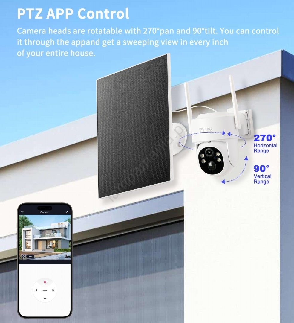• Graças ao painel solar de 5 W e à bateria integrada com capacidade de 9000 mAh, é totalmente independente de alimentação externa.