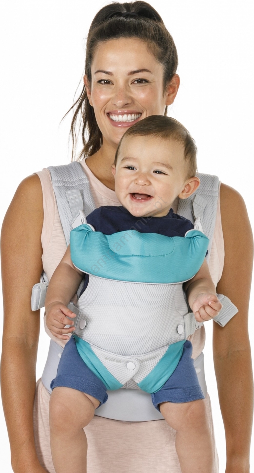 • Oferece 4 formas de transportar o bebé: sentado de pernas juntas em direção aos pais, sentado com as pernas afastadas em direção aos pais, sentado de costas para os pais, e carregando nas costas dos pais.