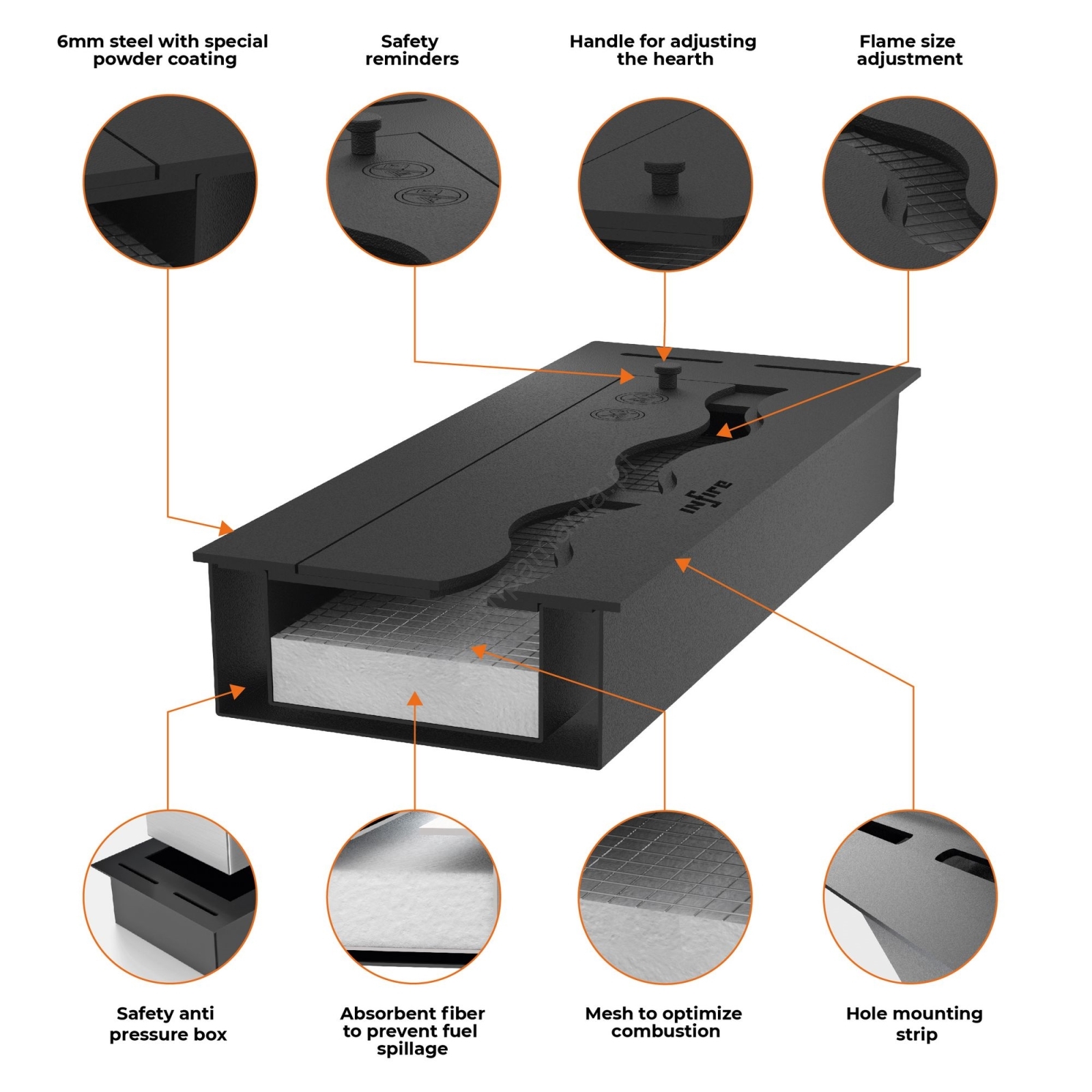 • Queimador seguro com inserto absorvente, que equilibra a temperatura do forno e prolonga o tempo de queima do biocombustível.