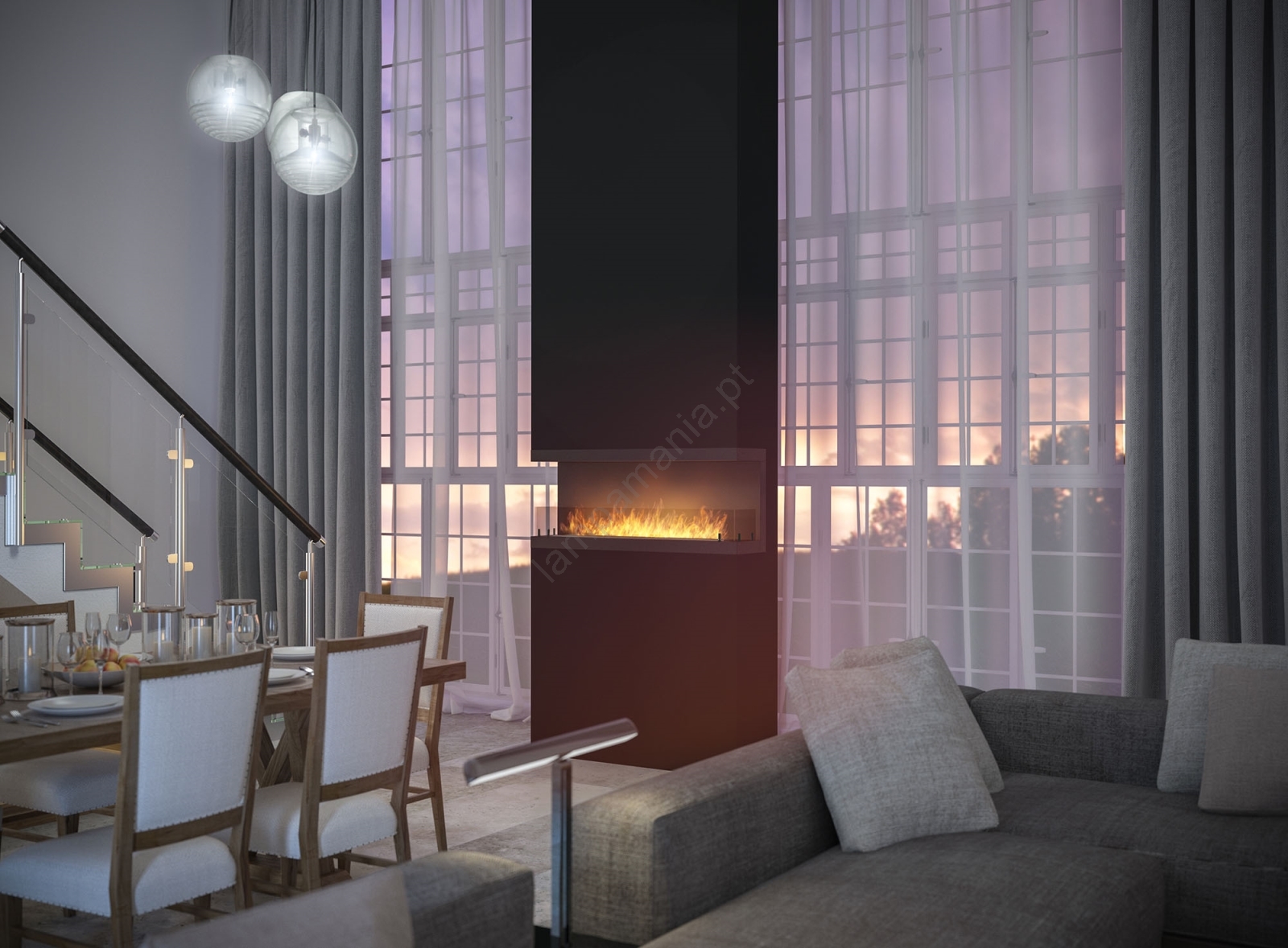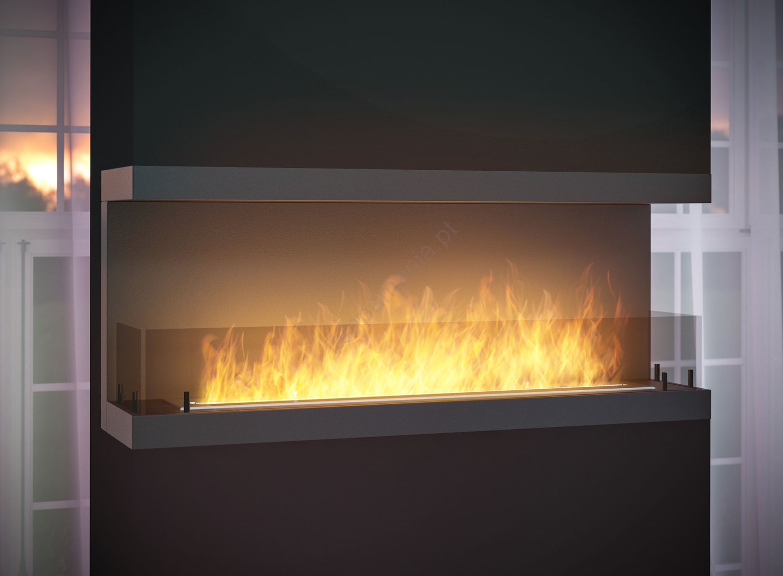 • O design da lareira permite que o fogo seja visto de três lados.