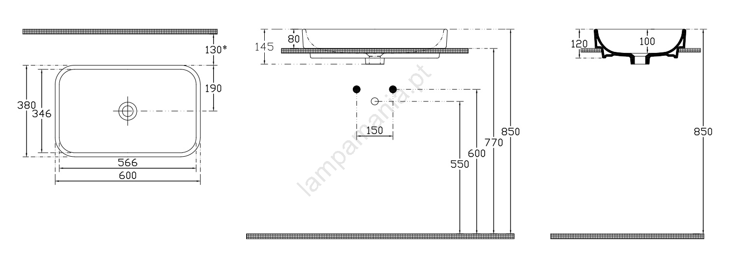 • O lavatório pode ser suspenso na parede, apoiado sobre a bancada ou encastrado na bancada.