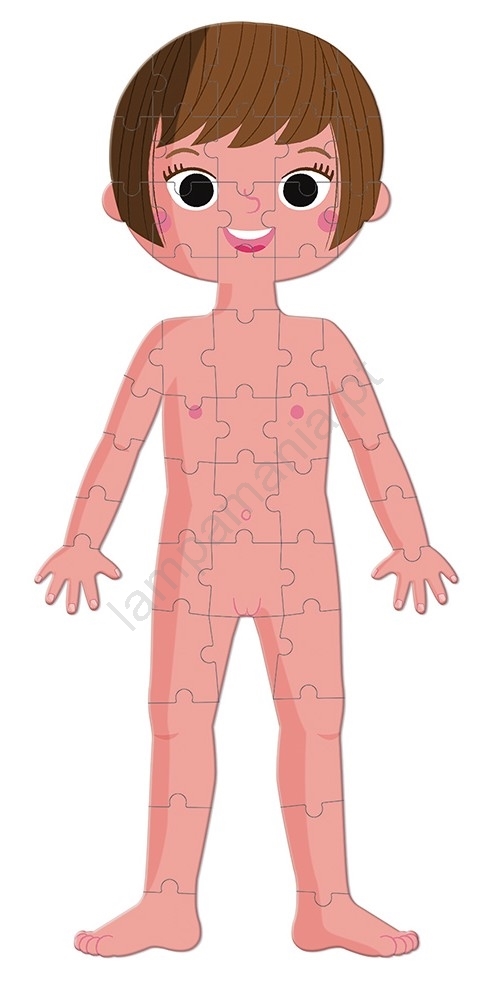 • O quebra-cabeça de 50 peças do corpo é dupla face - de um lado uma menina, do outro um menino.