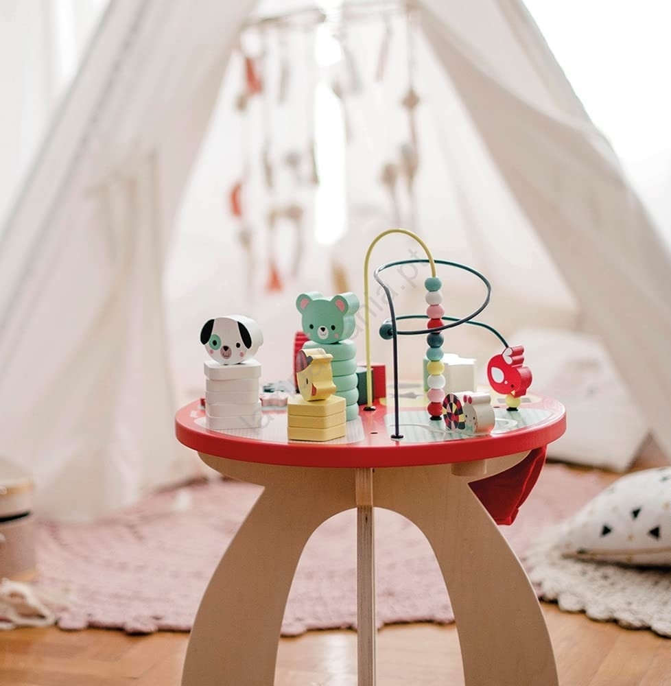 • Mesa de atividades colorida de madeira Baby Forest com diversas atividades com animais.