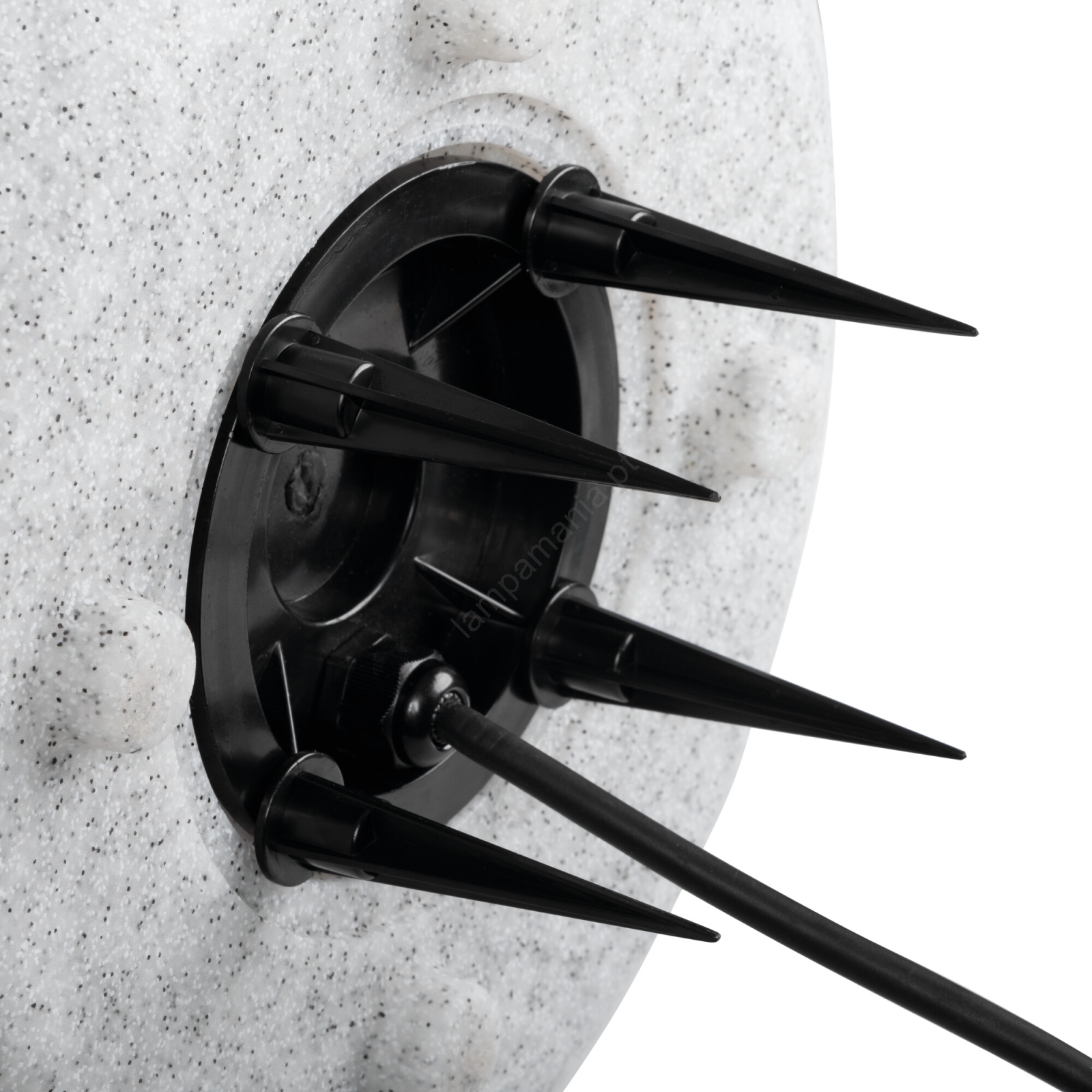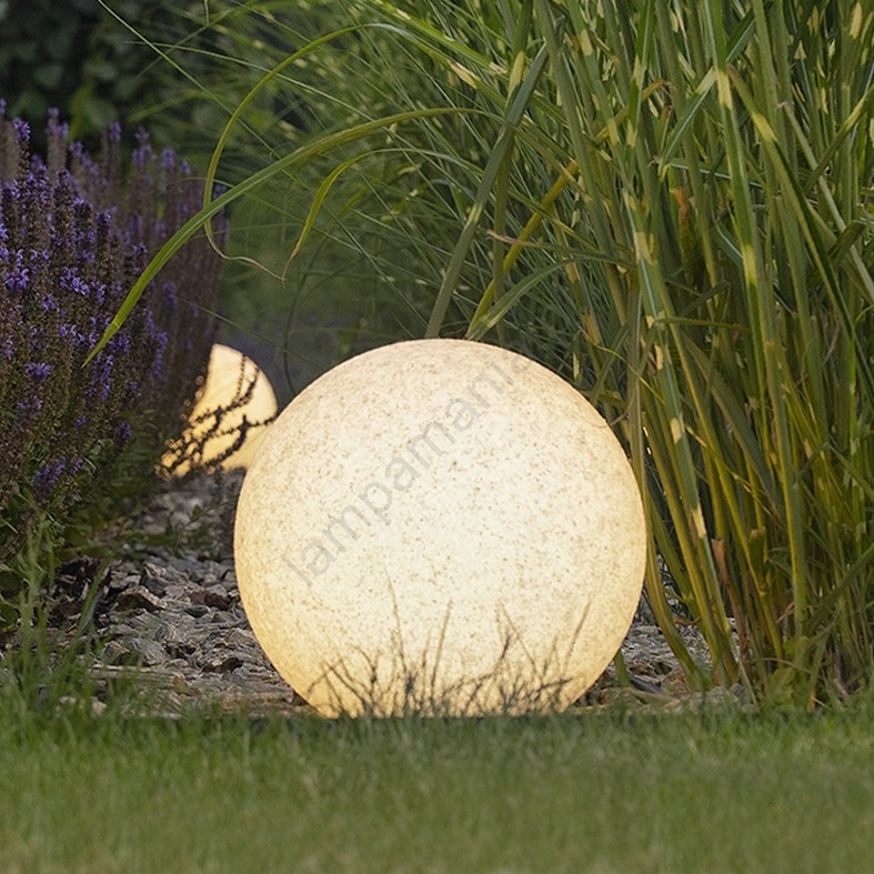 • Esta esfera luminosa que imita pedra é ideal para jardins rochosos ou ao redor de arbustos.