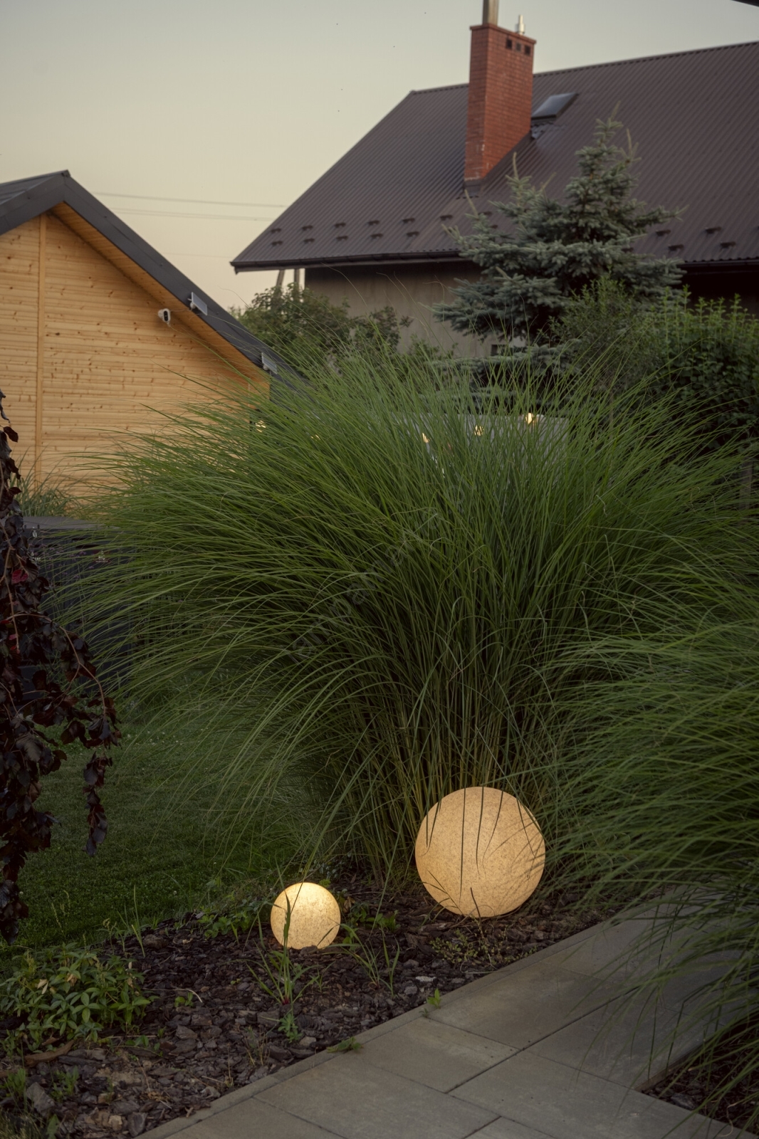 • Esta esfera luminosa com aspeto de pedra é ideal para jardins de pedra ou para o entorno de arbustos no seu jardim.