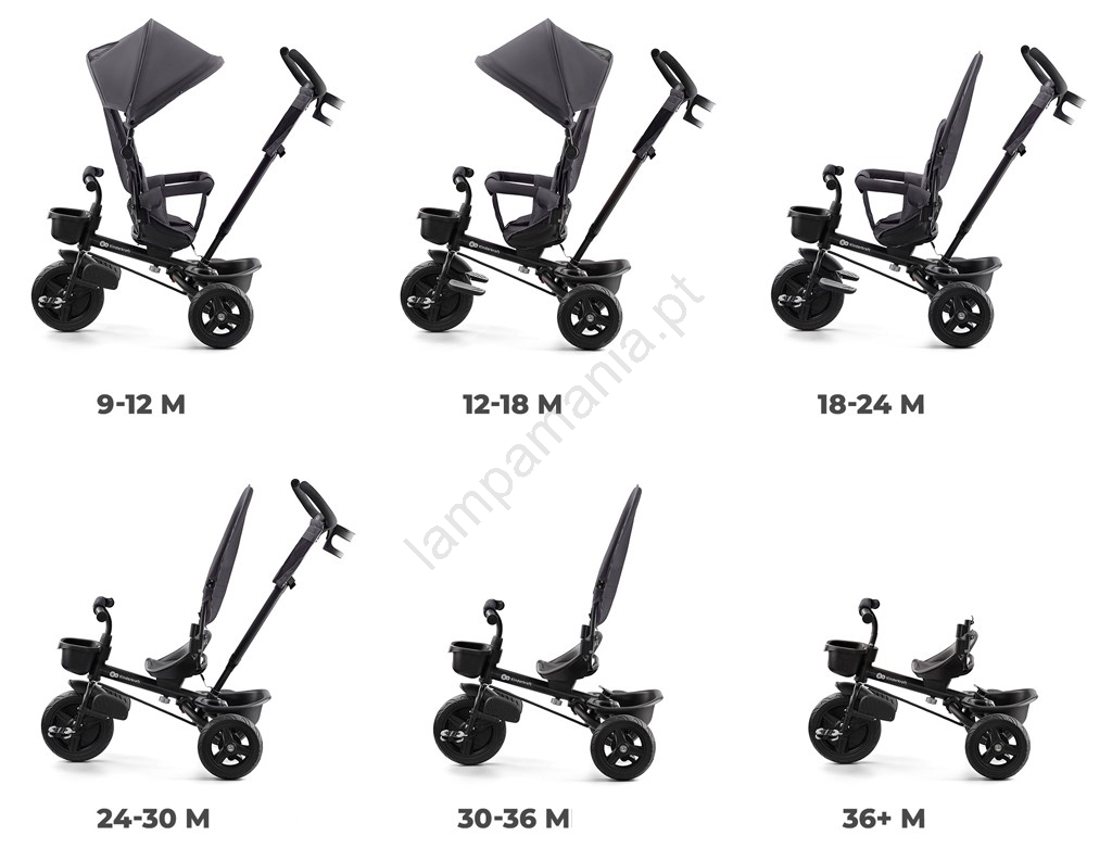 • O triciclo está equipado com cintos de segurança ajustáveis de 3 pontos e uma barreira de proteção.