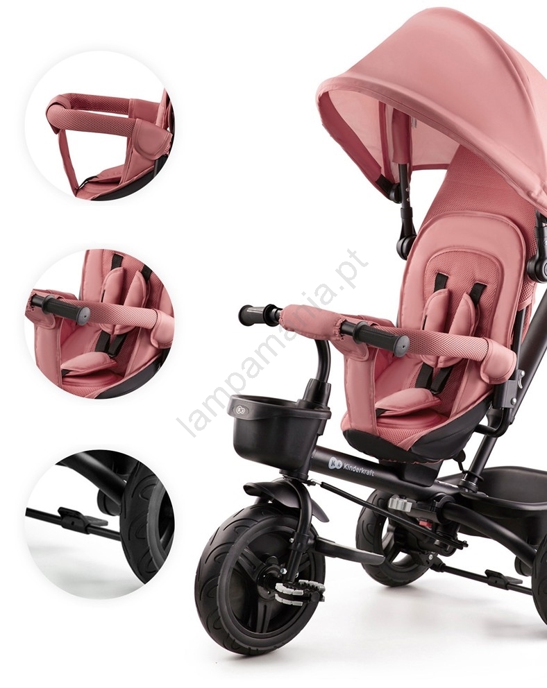 • O triciclo está equipado com cintos de segurança ajustáveis de 3 pontos e uma barreira de proteção.