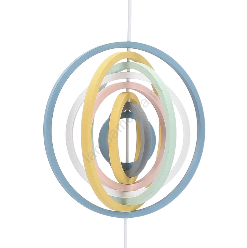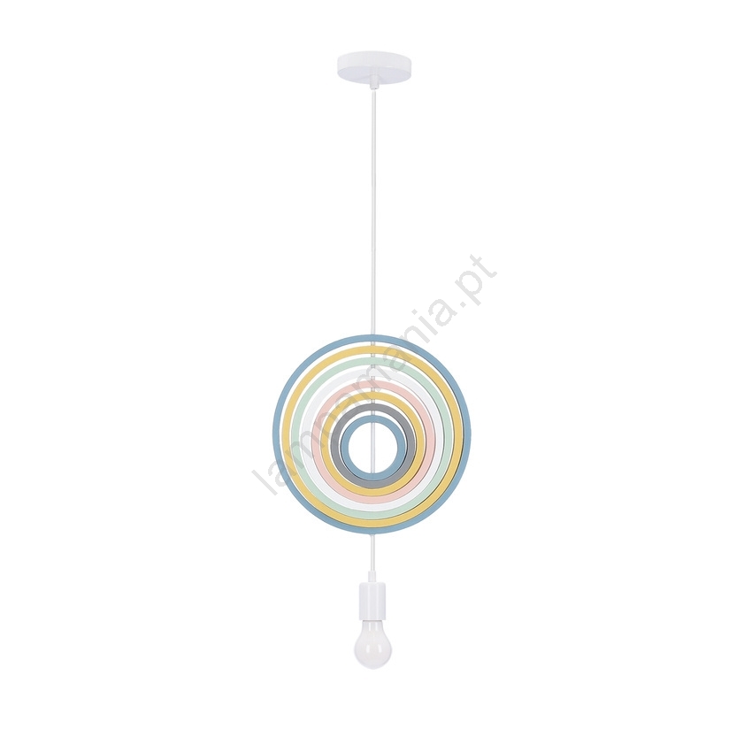 Candeeiro infantil suspenso por cabo HOOPS 1xE27/20W/230V Ø 27 cm multicolorido caracteriza-se por um design agradável e funcional.  Uma lâmpada com casquilho E27 é adequada para a iluminação Aqui, pode comprar outras lâmpadas a preços vantajosos. Terá um complemento interessante para a sua casa.