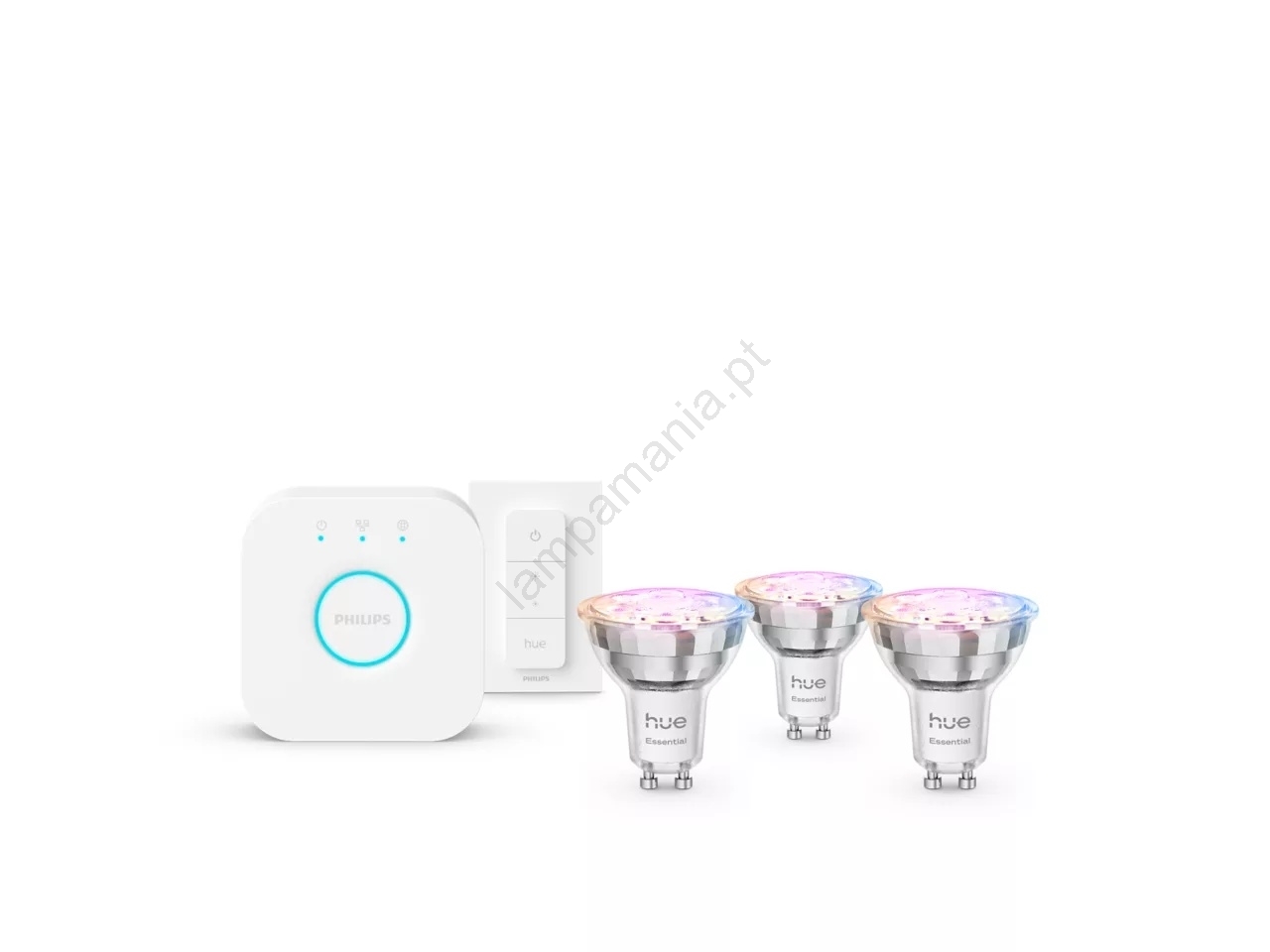 • O conjunto inclui o dispositivo de ligação Hue Bridge, interruptor com dimmer e 3 lâmpadas LED RGBW Philips Hue White And Color Ambiance Essentials com soquete GU10.