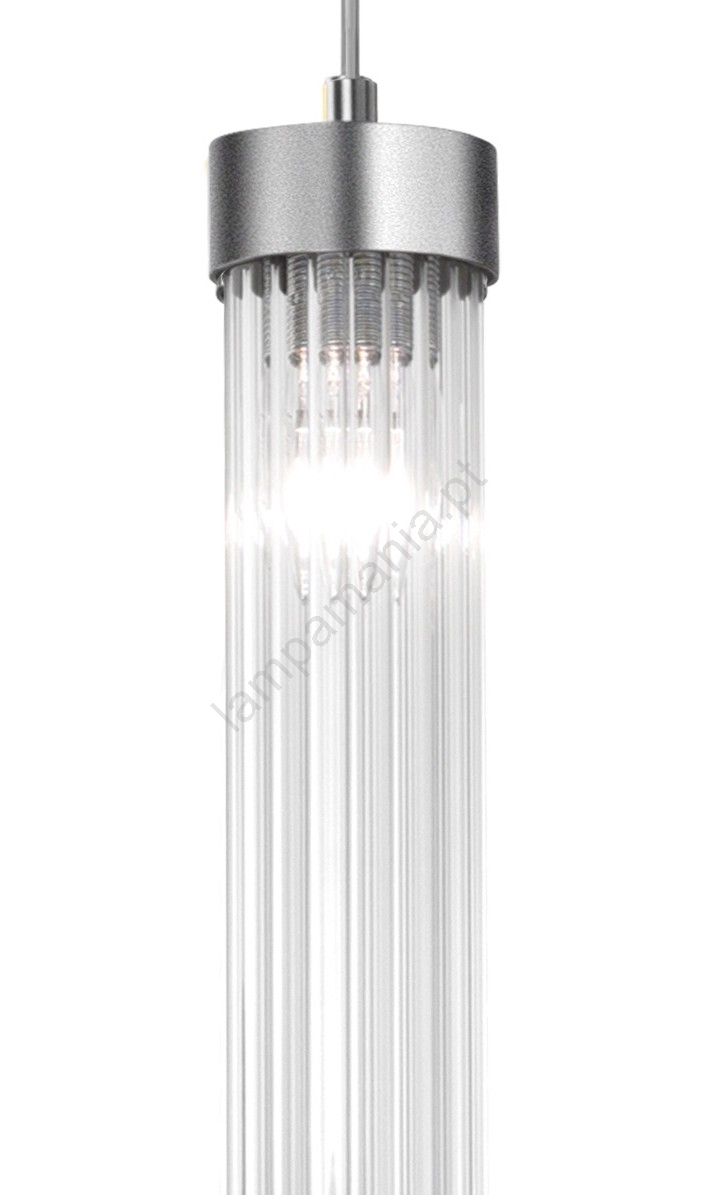 • É feito de uma base metálica niquelada, com um tom de vidro transparente estriado.
