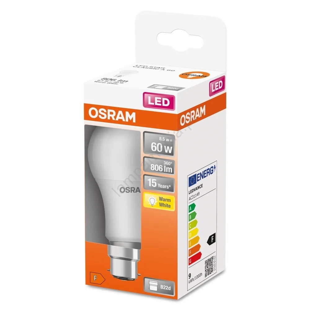 Lâmpada LED A60 B22d/8,5W/230V 2700K - Osram O design de alta qualidade garante uma iluminação perfeita do seu interior. A categoria B22d é dedicada às lâmpadas com o mesmo casquilho. Na nossa loja virtual, pode escolher entre lâmpadas com filamento tradicional ou lâmpadas LED modernas, que são mais eficientes em termos energéticos e têm uma vida útil mais longa.