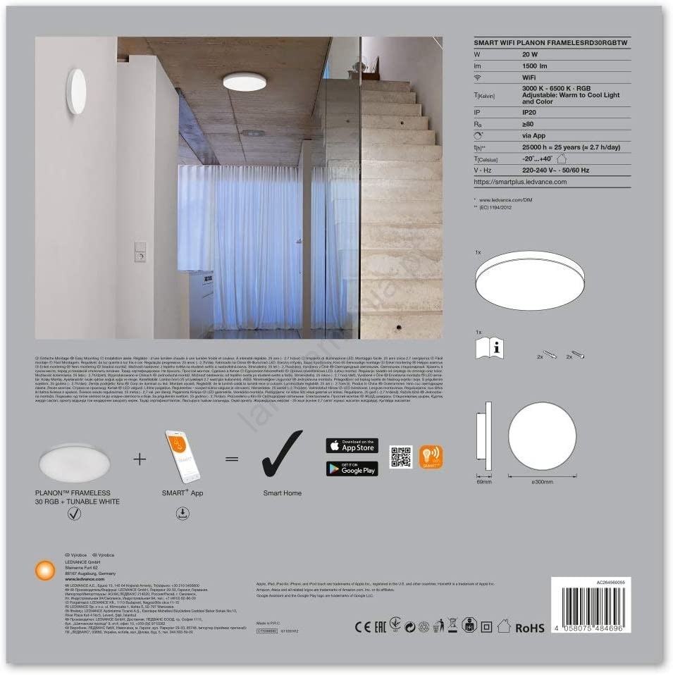 Ledvance - Iluminação LED RGB+TW com regulação SMART+ FRAMELESS LED/20W/230V 3000K-6500K