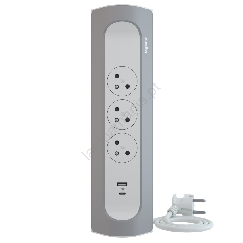 Legrand 049406 - Cabo de extensão 3 tomadas Tipo E + USB-A + USB-C 1m prateado/branco