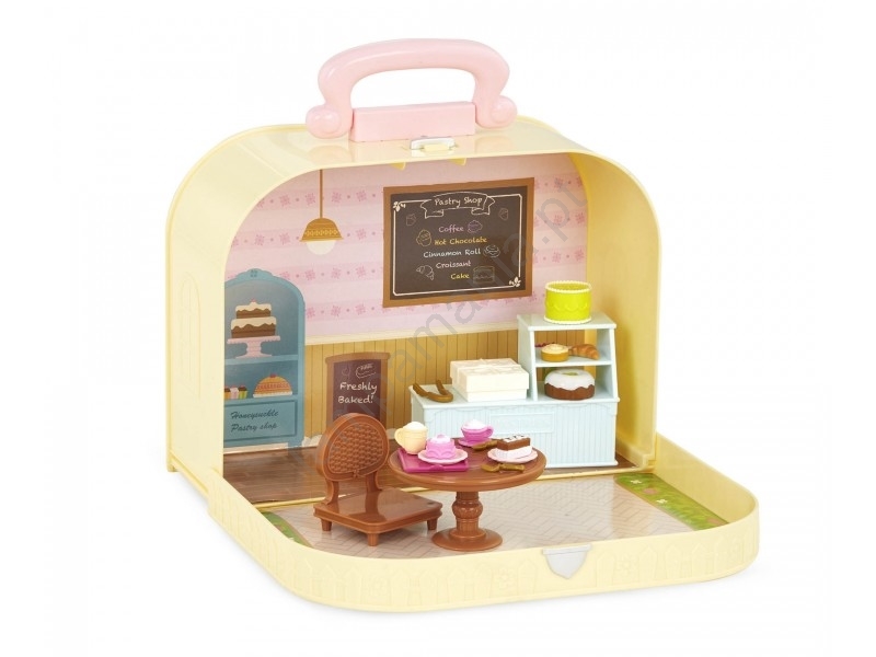 • O conjunto de 22 peças inclui a mala, 2 personagens caninos, balcão, mesa, cadeira, caixa, chocolate quente, bolo alto, bolo, 1 rolo de canela, croissant, bolo de chocolate, bandeja, 2 pratos, garfo, colher, pinça, cappuccino, pires, bolo de morango.