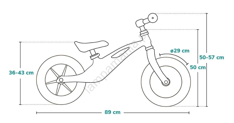 • Guiador ajustável em altura (50 - 57 cm) e selim (36 - 43 cm) garantem total adaptação para crianças até 6 anos.